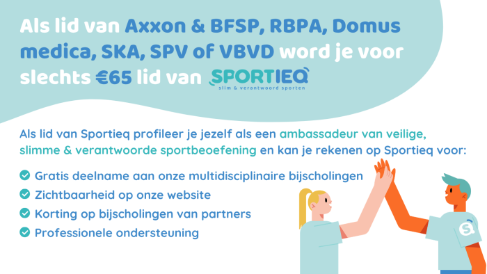 Word deel van het Sportieq-netwerk en profileer je als ambassadeur van veilige, slimme en verantwoorde sport. Met bijscholingen en kortingen haal je meteen meer uit je expertise.