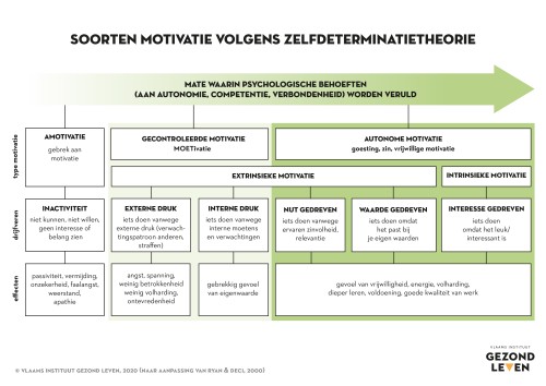 Motivatie is geen simpel aan of uit-knopje, maar beweegt zich volgens de zelfdeterminatietheorie van Ryan & Deci op een continuüm van amotivatie, gecontroleerde motivatie (ook wel ‘moetivatie’ genoemd) naar autonome motivatie.